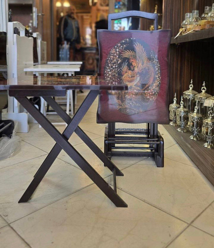 میز عسلی تاشو پولیشی قهوه ای طرحدار _ میز عسلی تاشو _ میز تاشو چمدانی